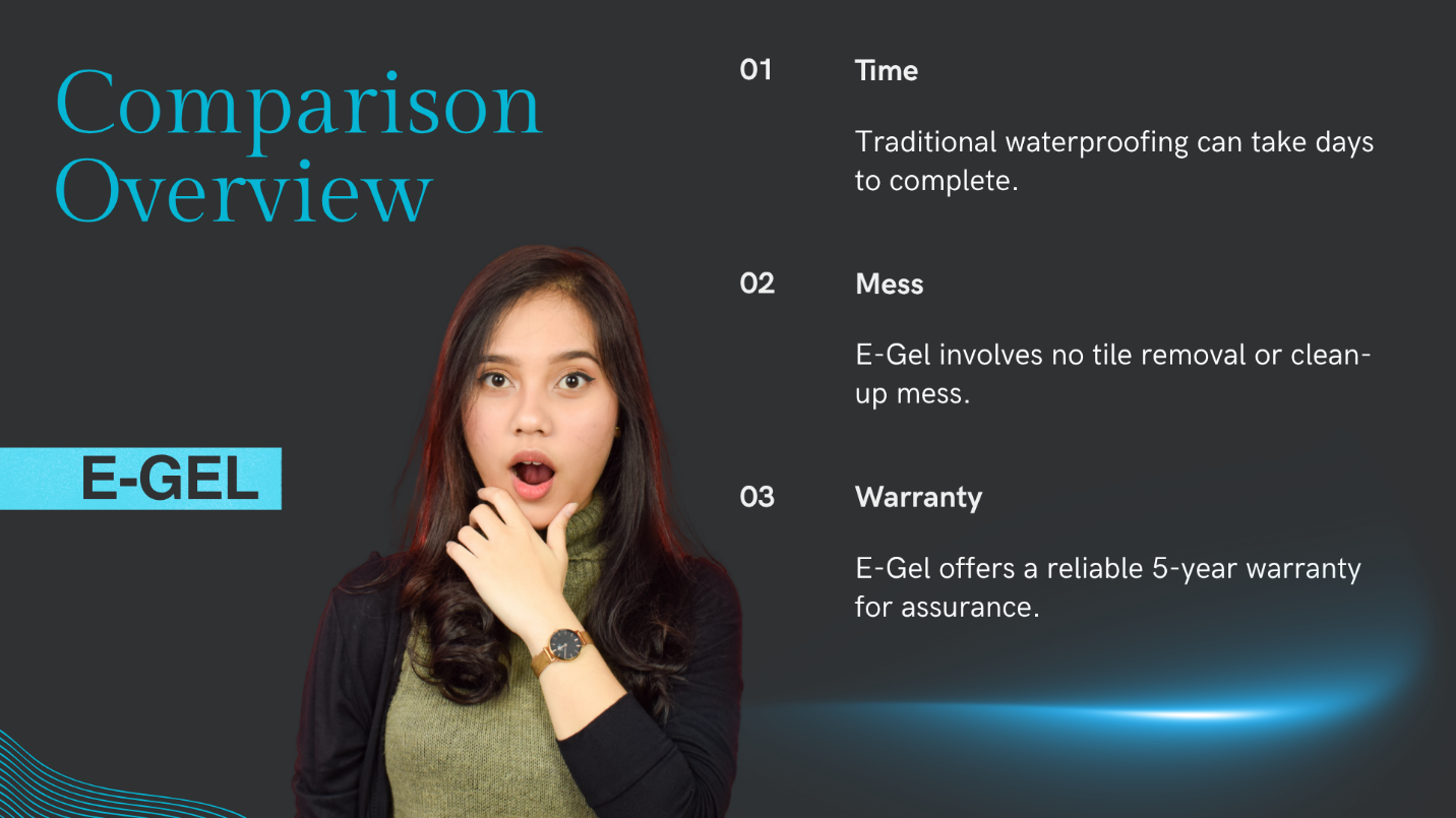 Kaedah ini menggunakan bahan cecair E-Gel khas yang disuntik ke lapisan jubin tanpa perlu pecahkan lantai. Ia menyerap ke retakan halus dan menghalang air daripada meresap ke struktur konkrit.