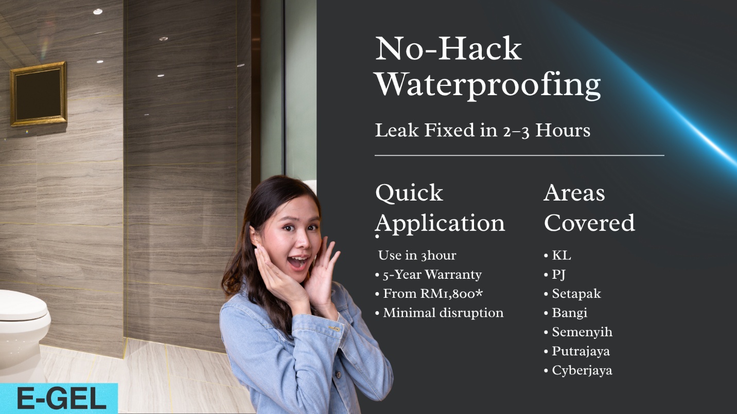 Gabungan iklim Malaysia yang mencabar dan teknologi kalis air moden seperti E-Gel bermakna anda akhirnya boleh memiliki bilik mandi tanpa bocor secara kekal tanpa gangguan kaedah godam dan ganti tradisional.