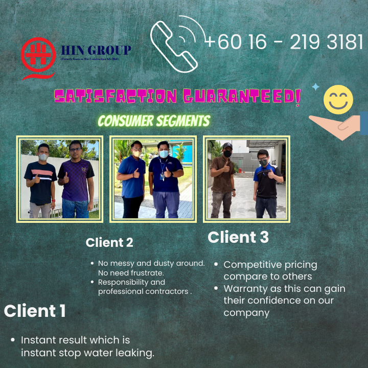 Hin Group 是马来西亚排名第一的浴室漏水维修专家,提供无需开裂的防水服务——无需拆除瓷砖,无尘,无延误。我们提供五年质保,可解决住宅、公寓和商业地产的各种大小漏水问题。
