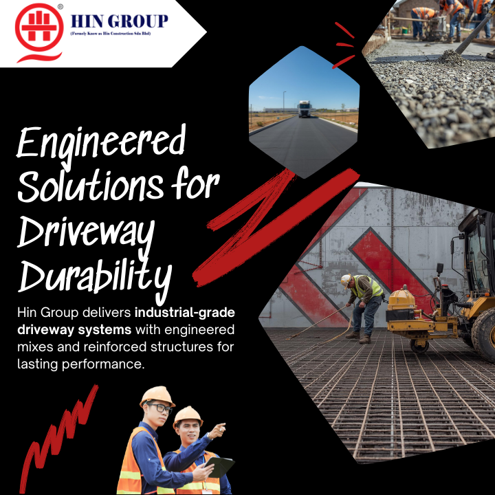 Hin Construction uses industrial-grade high-strength concrete, reinforced steel bars, professional expansion joint planning, and UV-resistant coloring — so it won’t fade quickly under Malaysian weather.