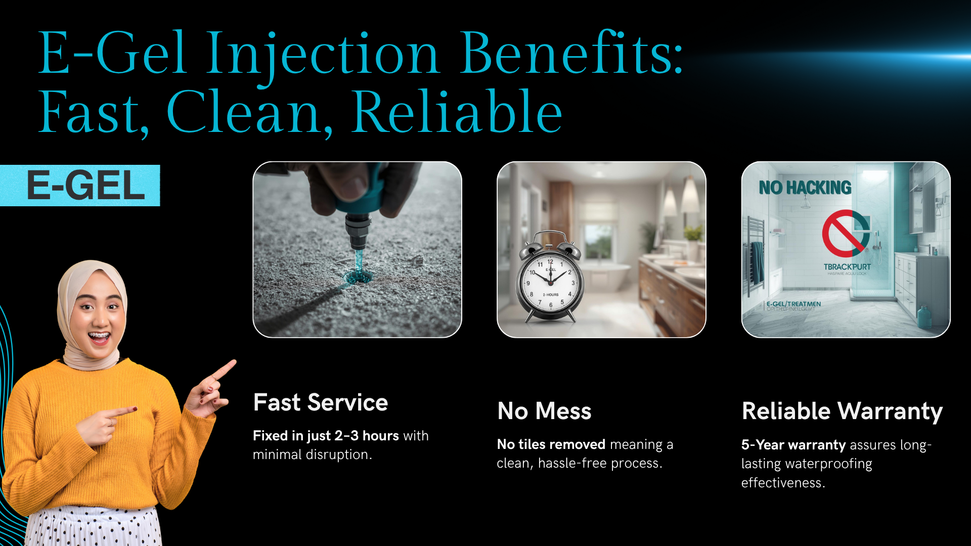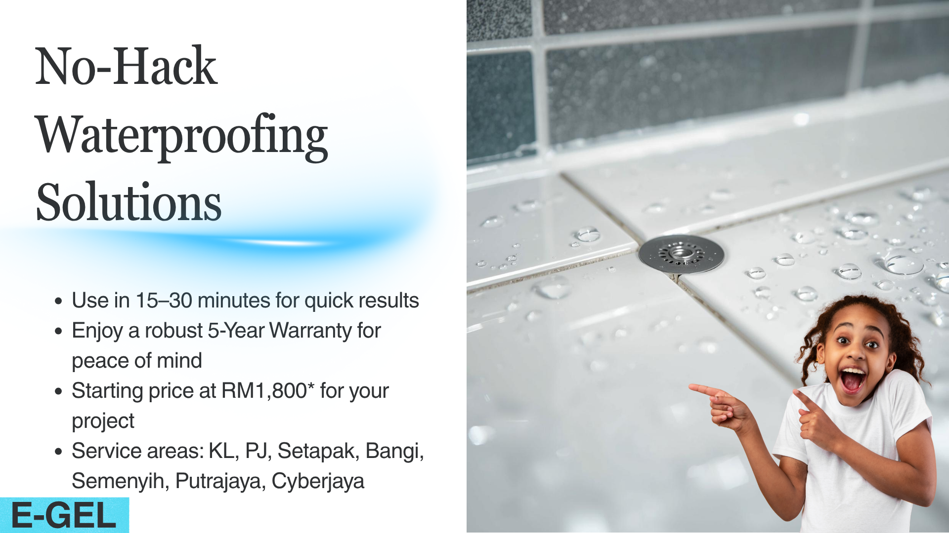 - Cost-effective in the long run: Starting around RM1,300 per bathroom, E-Gel fixes the problem permanently. You save money by avoiding repeat repairs. It comes with at least a 5-year no-leak warranty, and some providers even offer lifetime coverage.