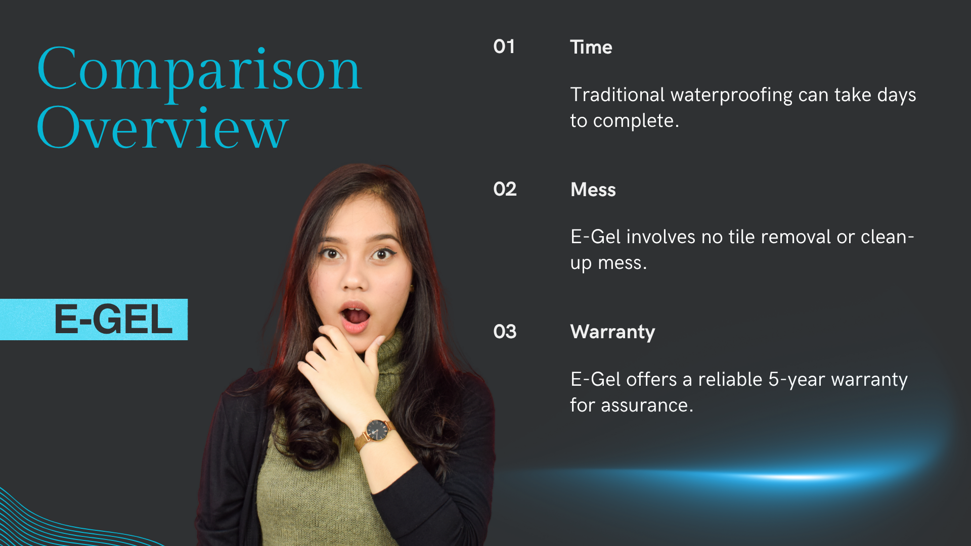 E-Gel has been gaining popularity across Malaysia because it simply outperforms conventional waterproofing methods. Let’s compare how it stacks up against older techniques:No Tile Removal or Hacking Needed
